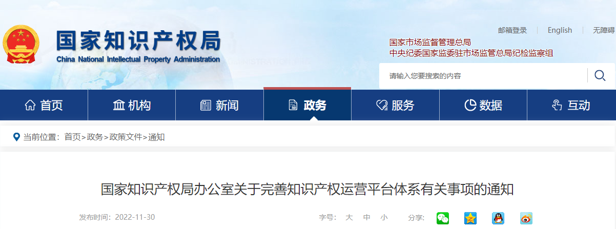 為深入貫徹落實黨的二十大精神,推進落實黨中央、國務院印發的《知識產權強國建設綱要(2021—2035年)》和國務院印發的《“十四五”國家知識產權保護和運用規劃》,將中辦、國辦印發的《建設高標準市場體系行動方案》關于“建設國家知識產權和科技成果產權交易機構”部署落實落地,按照《國家知識產權局關于促進和規范知識產權運營工作的通知》(國知發運字〔2021〕22號)要求,推進實施知識產權運營體系建設工程,在前期工作基礎上,進一步完善知識產權運營平臺體系,現將有關事項通知如下: