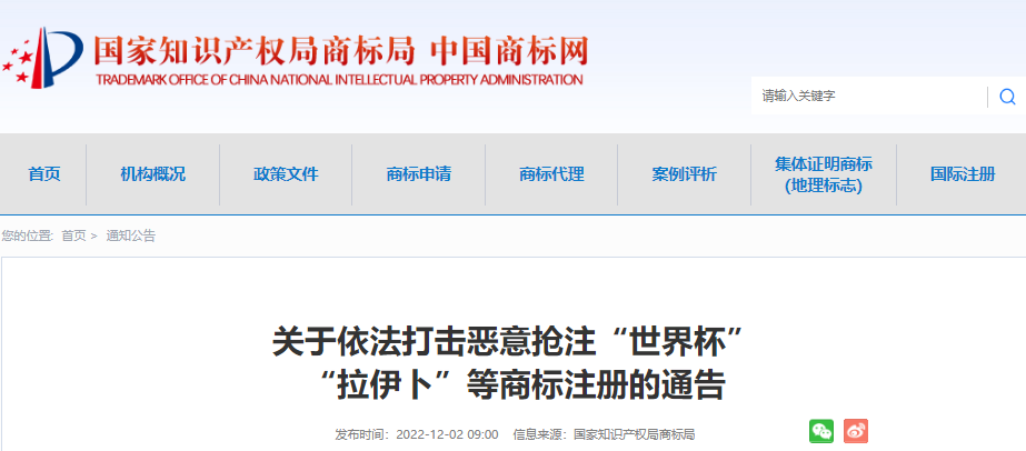 國(guó)家知識(shí)產(chǎn)權(quán)局高度重視卡塔爾世界杯知識(shí)產(chǎn)權(quán)保護(hù)工作,堅(jiān)決打擊惡意搶注行為,依據(jù)《商標(biāo)法》第十條第一款第(七)項(xiàng)等規(guī)定,對(duì)第66999855號(hào)“世界杯”、第63803887號(hào)“LAEEB”等26件商標(biāo)注冊(cè)申請(qǐng)予以駁回;依據(jù)《商標(biāo)法》第四十四條第一款規(guī)定,對(duì)已注冊(cè)的第63767652號(hào)“LAEEBS”商標(biāo)依職權(quán)宣告無效。