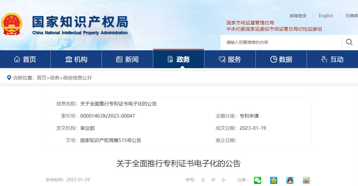 為貫徹落實(shí)黨中央、國務(wù)院關(guān)于加強(qiáng)數(shù)字政府建設(shè)的決策部署,持續(xù)提高專利審查服務(wù)信息化和便利化水平,國家知識產(chǎn)權(quán)局自2023年2月7日(含當(dāng)日)起,全面推行專利證書電子化。