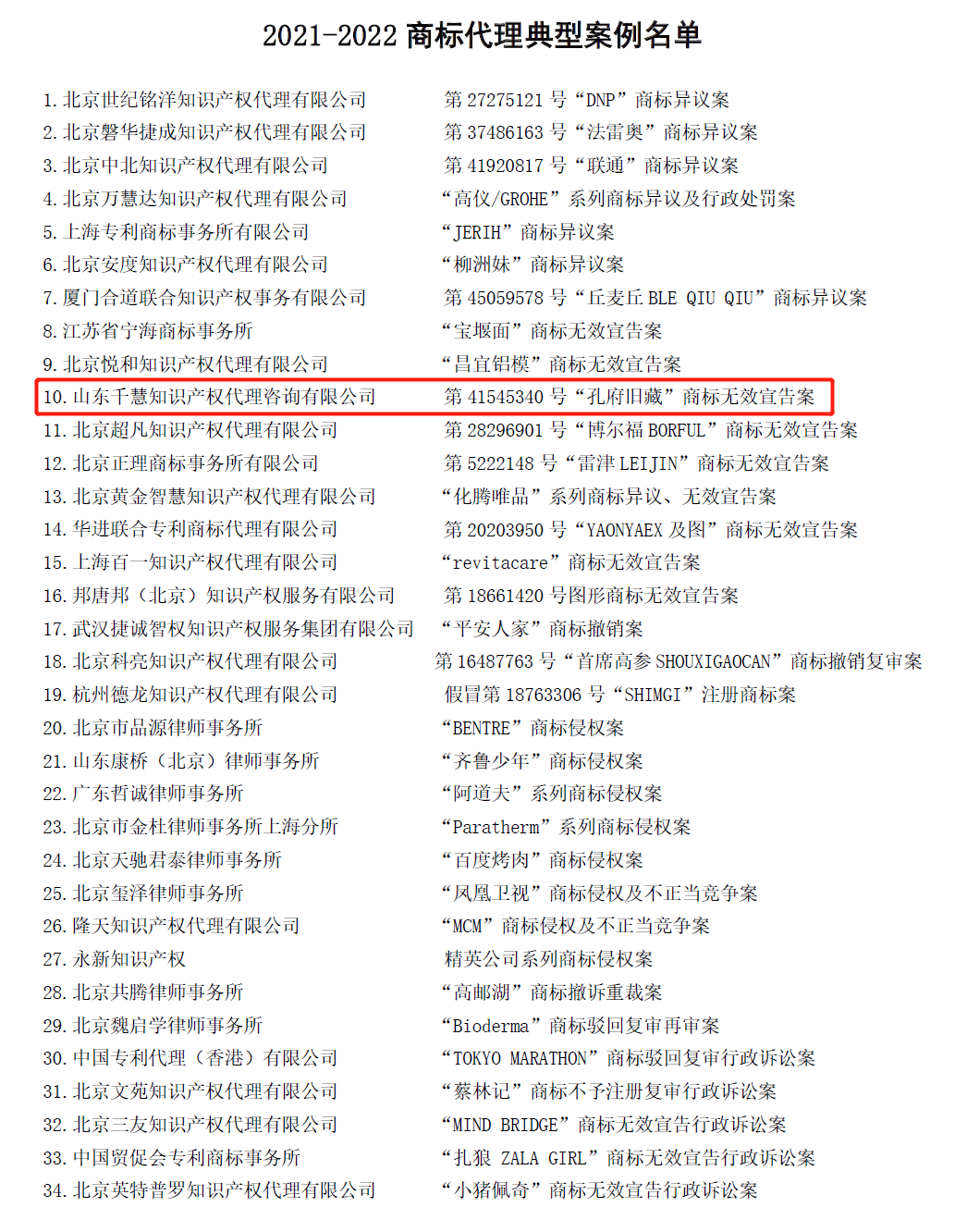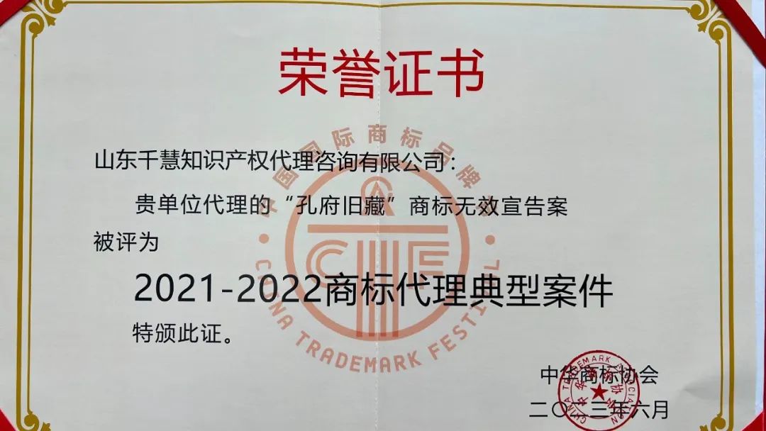 在6月16日商標品牌節歡迎會頒獎典禮及6月17日商標典型案例評析論壇上,千慧集團憑借專業精神以及卓越服務,獲評“2021-2022年度優秀商標代理機構”,并且代理的“孔府舊藏”商標無效宣告一案被評為“2021-2022年度商標代理典型案例”。