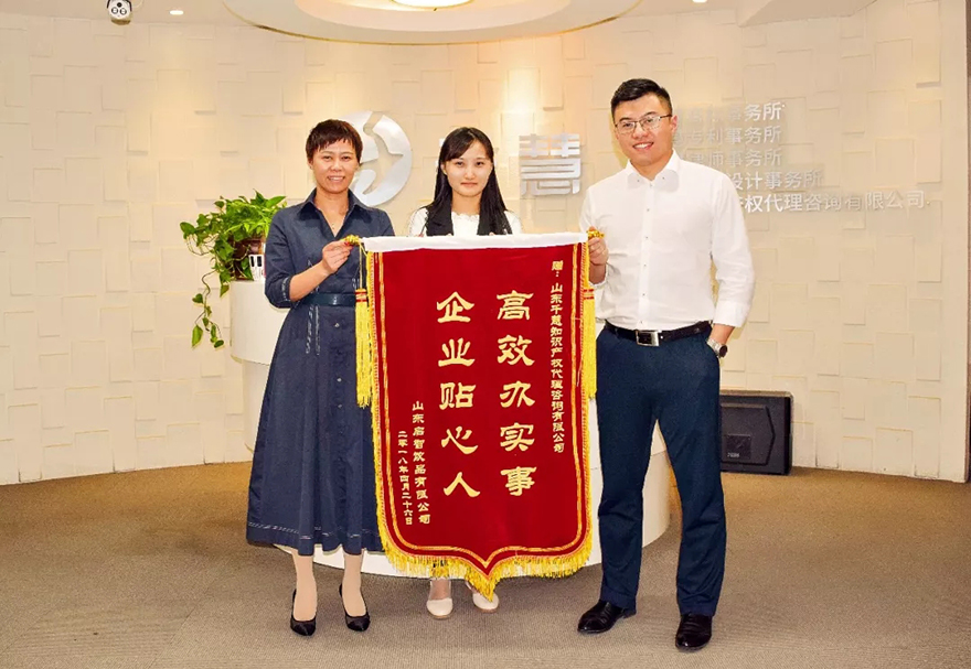 2017年,山東啟智飲品有限公司岳總因商標(biāo)異議問題又找到了千慧,由于案情復(fù)雜,隨即開始了近一年的服務(wù),并于近日打贏了這場(chǎng)商標(biāo)異議及商標(biāo)無效宣告案件。在這個(gè)過程中,千慧團(tuán)隊(duì)利他、誠信、專業(yè)、專注的服務(wù)理念和真誠、細(xì)致、認(rèn)真、負(fù)責(zé)的敬業(yè)態(tài)度贏得了岳總的贊譽(yù),并獲贈(zèng)一副題為“高效辦實(shí)事,企業(yè)貼心人”的錦旗。