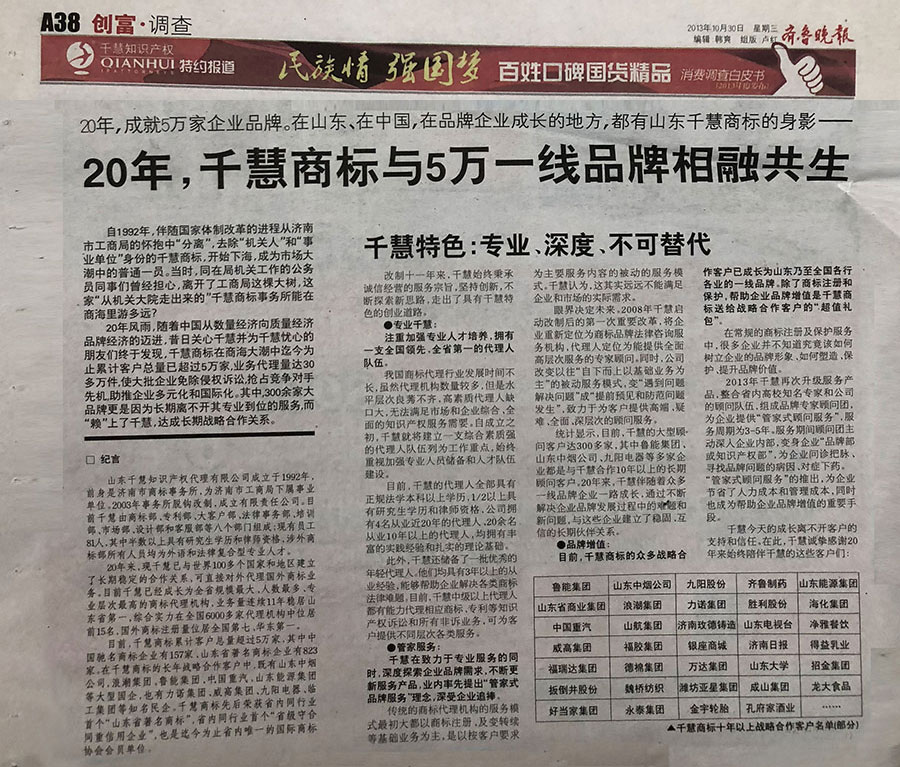 20年風(fēng)雨,隨著中國從數(shù)量經(jīng)濟(jì)向質(zhì)量經(jīng)濟(jì)品牌經(jīng)濟(jì)的邁進(jìn),昔日關(guān)心千慧并為千慧憂心的朋友們終于發(fā)現(xiàn),千慧商標(biāo)在商海大潮中迄今為止累計(jì)客戶總量已超過5萬家,業(yè)務(wù)代理量達(dá)30多萬件,使大批企業(yè)免除侵權(quán)訴訟,搶占競爭對手先機(jī),助推企業(yè)多元化和國際化。其中,300余家大品牌更是因?yàn)殚L期離不開其專業(yè)到位的服務(wù),而“賴”上了千慧,達(dá)成長期戰(zhàn)略合作關(guān)系。