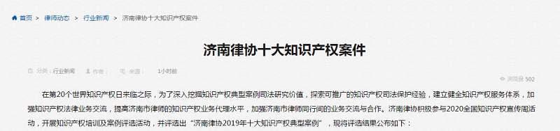 【聚焦】山東千慧律師事務所兩例代理案件入選“濟南律協2019年十大知識產權典型案例”