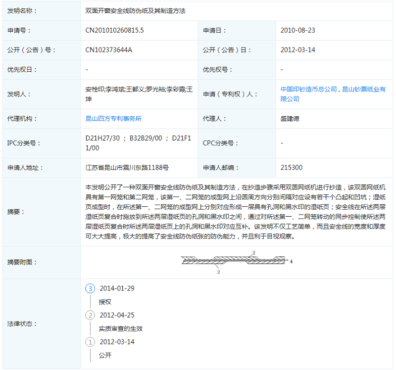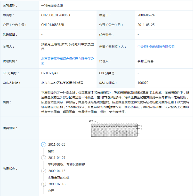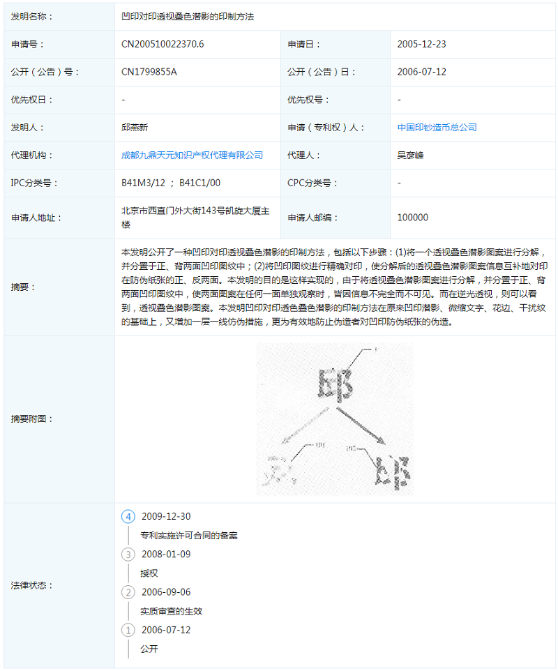 其實早在2005年,中國印鈔造幣總公司就申請了一項“凹印對印透視疊色潛影的印制方法”發(fā)明專利。