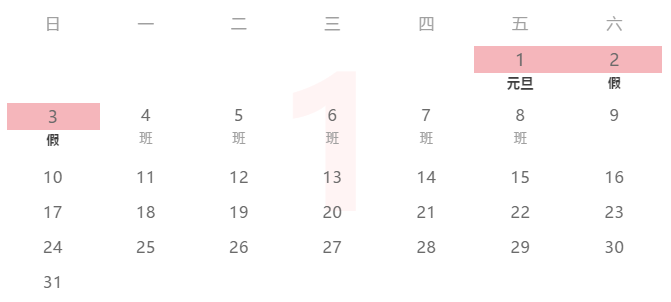 放假時間:1月1日(星期五)至3日(星期日)放假,共3天。1月4日(星期一)起正常上班。