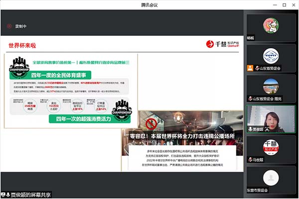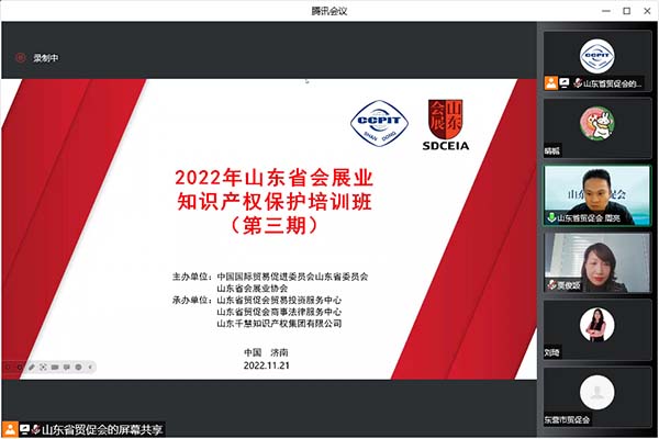 11月21日下午,2022年山東省會展業知識產權保護系列培訓班(第三期)成功舉辦。本次培訓采用線上方式,邀請到山東千慧知識產權集團業務總監、山東省知識產權人才專家庫成員賈俊穎女士,以《國內展會知識產權侵權風險防范與海外展會風險應對策略》為題進行了分享交流,省、各市貿促會會展業務負責人、省會展業協會會員和參展企業等共70余家單位、100余人參加了培訓。