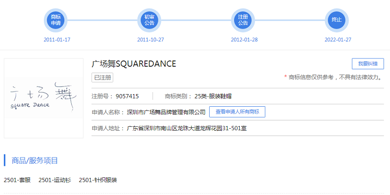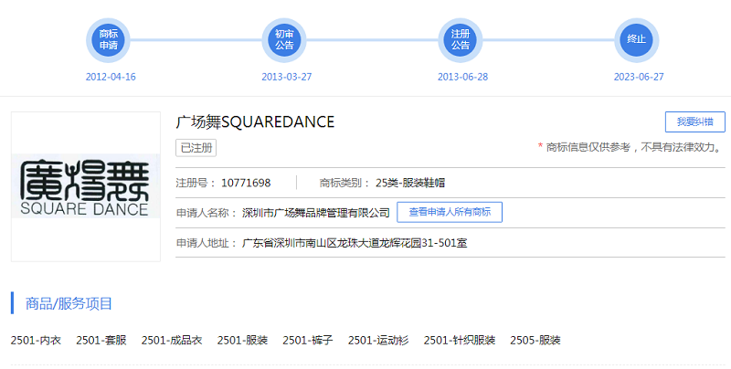 事情是這樣的,深圳某服裝行分別于2011年和2012年申請了第9057415號“廣場舞”商標和第10771698號“廣場舞”商標,核定使用于熱門類別第25類-服裝鞋帽等商品上。