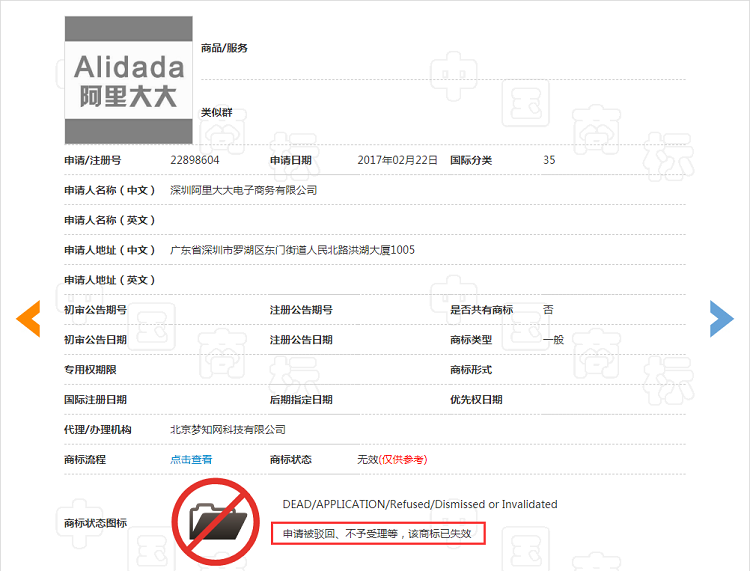 經過檢索發現,同第33486518號“阿里婆婆”商標經歷類似的還有第22898604號“阿里大大”商標。