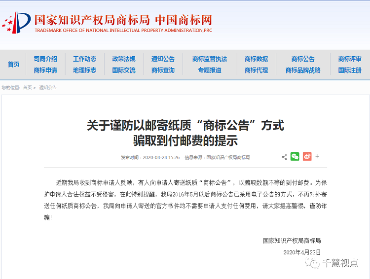 【警惕】關于謹防以郵寄紙質“商標公告”方式騙取到付郵費的提示