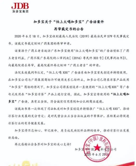 加多寶在公告中稱,法院生效裁判書認定,“怕上火喝XXX”廣告語系由加多寶首先創設并持續使用,在加多寶公司與廣藥集團商標許可使用關系已經終止,加多寶公司已將其涼茶產品改用“加多寶”商標的情況下,加多寶公司將其創設并一直使用的“怕上火喝XX”等廣告句式改用在“加多寶涼茶”產品上進行宣傳,因此,加多寶宣傳使用的“怕上火喝加多寶”廣告語,具有正當性,符合誠實信用原則和公認的商業道德。