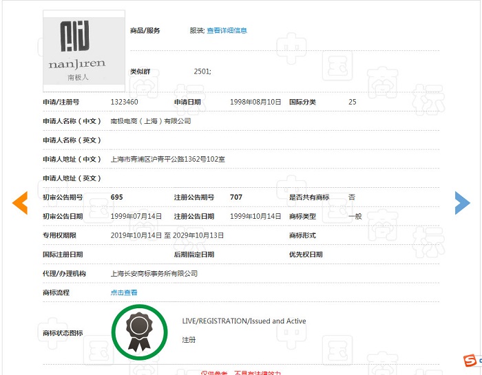 其中第一件南極人商標申請于1998年8月10日,目前核準使用在第25類服裝。