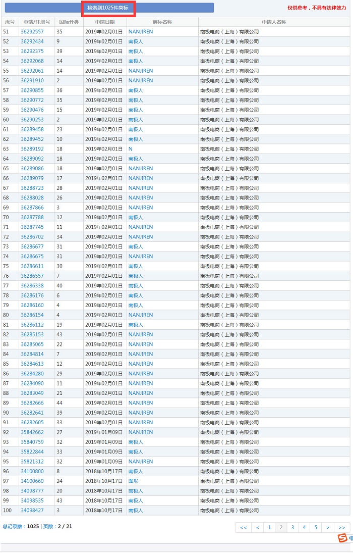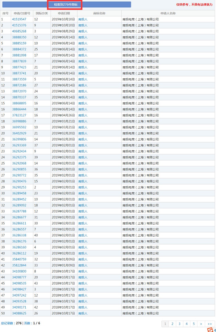 而南極電商共申請了包含“南極人”字樣的申請商標276件。