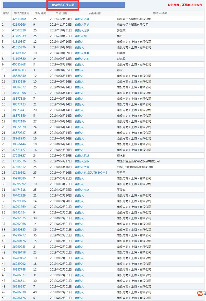 商標局網站查詢得知,目前含有“南極人”字樣的申請商標共有333件;