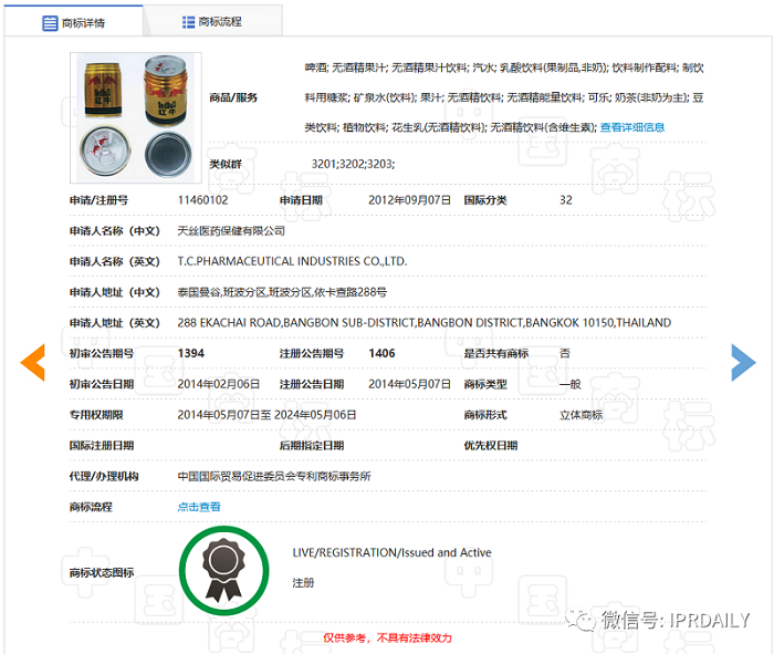 據中國商標網顯示,此次的爭議商標由天絲醫藥于2012年9月7日申請,2014年5月7日核準注冊,商標專用期至2024年5月6日。從商標圖的顯示來看,此立體商標就是紅牛的金罐包裝。