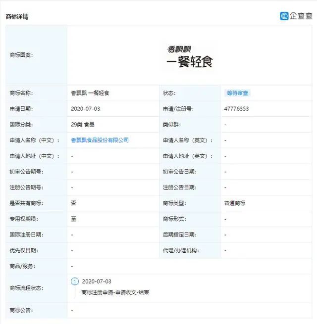 8月5日,記者從天眼查APP查詢到,香飄飄食品股份有限公司新增多條商標信息,其中包括了“香飄飄 一餐輕食”,申請日期為2020年7月3日,商標狀態為“等待實質審查”,分類包括方便食品、啤酒飲料、食品。