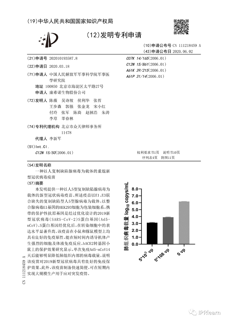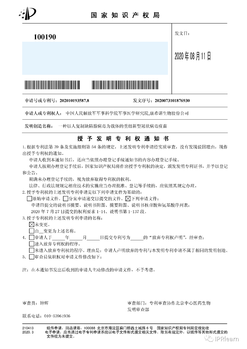 據國家知識產權局介紹,經核,該疫苗專利申請發明名稱為“一種以人復制缺陷腺病毒為載體的重組新型冠狀病毒疫苗”,該專利申請號為202010193587.8,申請人為中國人民解放軍軍事科學院軍事醫學研究院和康希諾生物股份公司,發明人為陳薇等,申請日為2020年3月18日,經提交優先審查請求后,國家知識產權局于2020年8月11日發出專利授權通知書,待申請人依法辦理專利權登記手續后,該局將公告授權該專利。