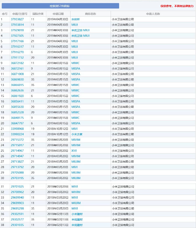 據了解,小米衛浴公司于2014年4月3日注冊成立,經營范圍涉及生產、加工、銷售衛浴潔具配套產品、五金制品及配件、家具、陶瓷制品、日用品等。小米衛浴公司原法定代表人王某某于2012年3月5日提交了第16493289號“MIUI”商標的注冊申請,2016年6月7日被核準注冊使用在滅火器、計步器等第9類商品上;2013年11月25日,王某某提交第13595158號、第13595159號“MIUI”商標注冊申請,2015年2月28日分別被核準注冊使用在家庭用陶瓷制品、垃圾桶等第21類商品與家具、竹木工藝品等第20類商品;2014年4月14日,王某某提交了第14368244號“MIUI”商標的注冊申請,2015年5月28日被核準注冊使用在金屬水管閥、普通金屬藝術品等第6類商品。經核準,王某某將其提交注冊申請的上述后3件“MIUI”商標轉讓予小米衛浴公司。