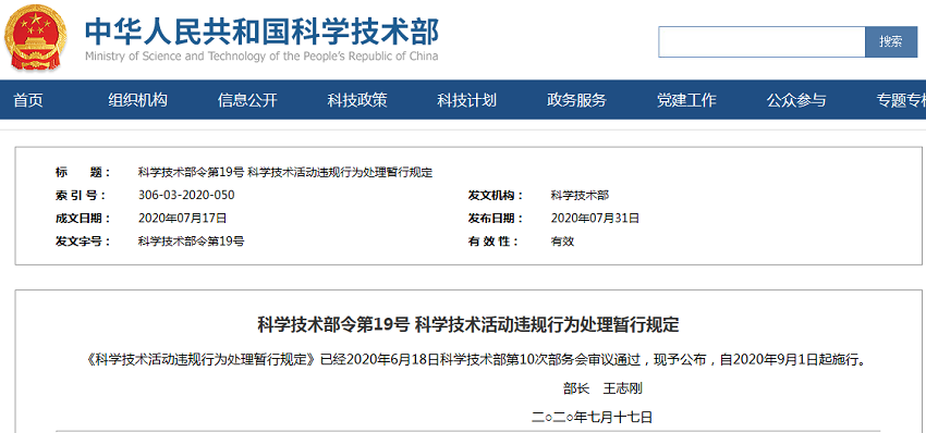 近日,科技部網(wǎng)站發(fā)布了“科學(xué)技術(shù)部令第19號(hào) 科學(xué)技術(shù)活動(dòng)違規(guī)行為處理暫行規(guī)定”,自2020年9月1日起施行。