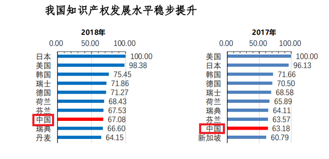 截至2018年,全球知識產權發展水平排名前10分別為日本、美國、韓國、瑞士、德國、荷蘭、芬蘭、中國、瑞典和丹麥。如果單看知識產權能力,我國2018年已躍居全球第五,僅次于美國、日本、瑞士和芬蘭;知識產權績效全球第3位。我國知識產權大國的地位更穩了。
