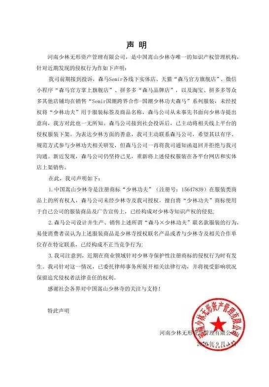 9月1日,嵩山少林寺發(fā)布聲明,稱嵩山少林寺是注冊(cè)商標(biāo)“少林功夫”在服裝類商品上的所有權(quán)人,森馬在各平臺(tái)在售的“Semir國(guó)潮跨界合作-國(guó)潮少林功夫森馬”系列服裝,未經(jīng)授權(quán)將“少林功夫”用于服裝標(biāo)簽及商品名稱,已侵犯少林寺知識(shí)產(chǎn)權(quán)。