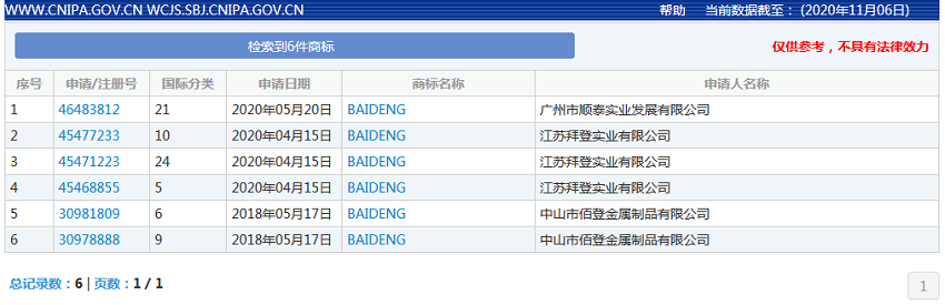 江蘇拜登實業有限公司申請了6“拜登”及“baideng”商標,其中兩件商標已初審公告,商標核準類別主要為第24類布料床單、第10類醫療器械等。