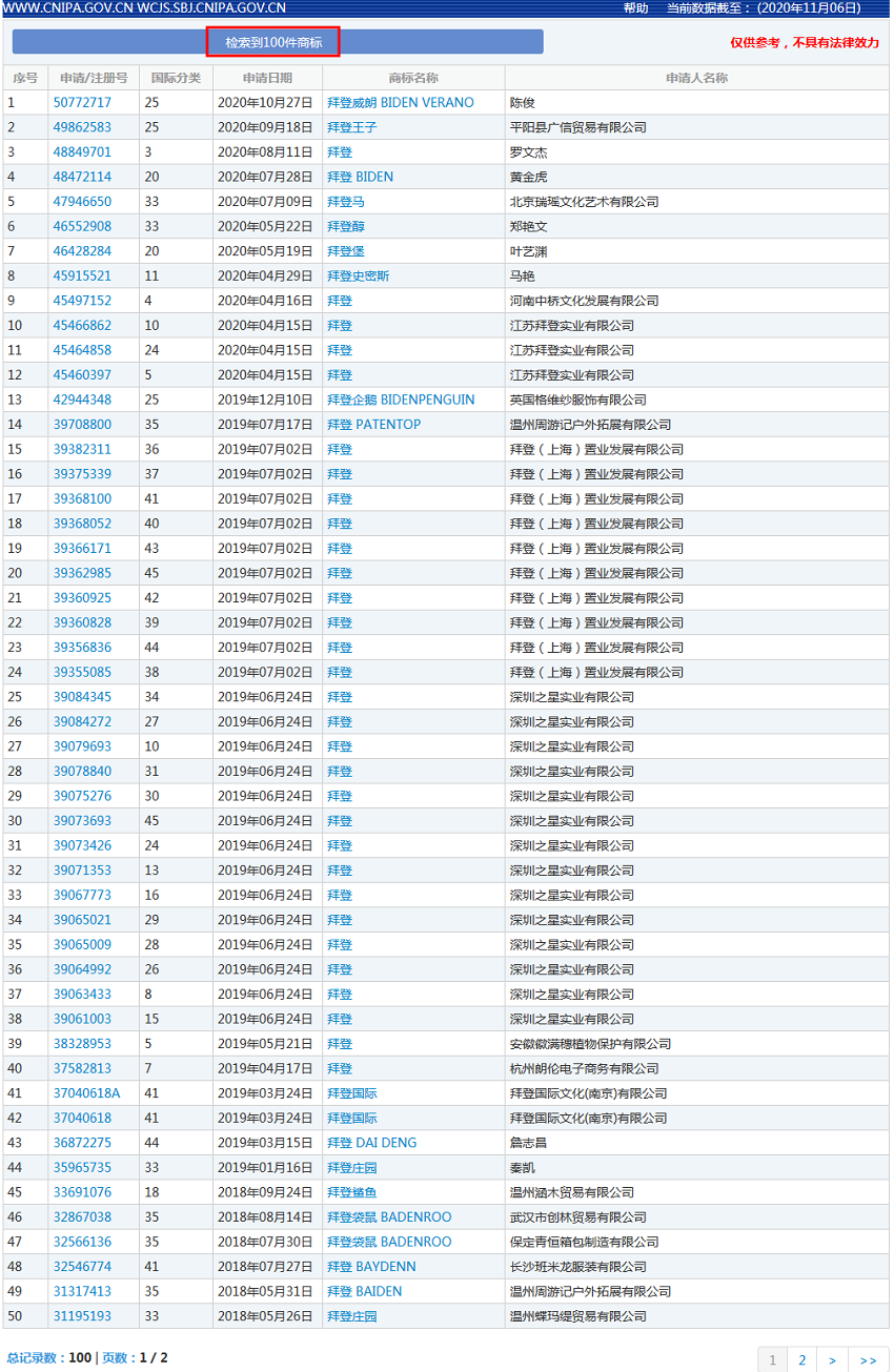 據中國商標網查詢可知,截止2020年11月6日,申請“拜登”相關商標的有106件。