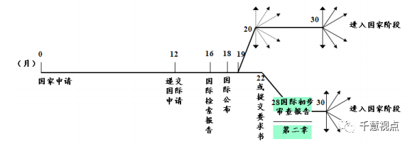 PCT進入國家階段申請途徑分為“國際階段”和“國家階段”,其中,國際階段由國際申請的提交、國際檢索、國際公布、國際初步審查(可選步驟)構成,具體審批流程如下圖所示: