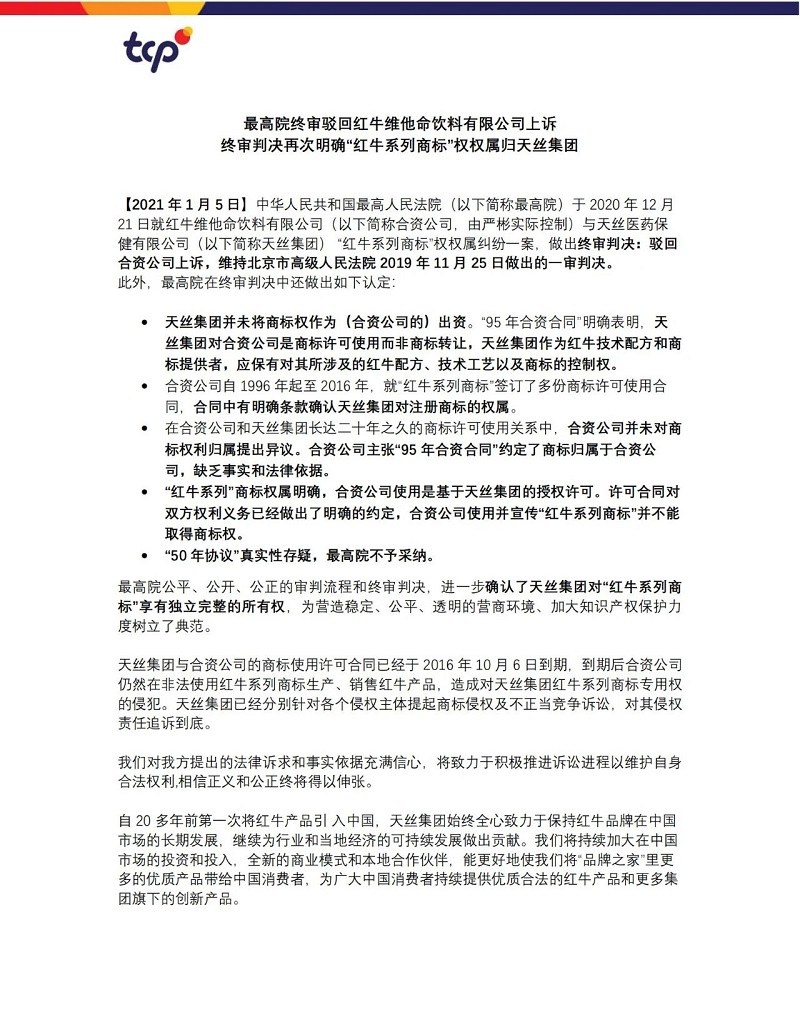 【2021年1月5日】中華人民共和國最高人民法院(以下簡稱最高院)于 2020 年 12 月21 日就紅牛維他命飲料有限公司(以下簡稱合資公司,由嚴彬實際控制)與天絲醫藥保健有限公司(以下簡稱天絲集團) “紅牛系列商標”權權屬糾紛一案,做出終審判決:駁回合資公司上訴,維持北京市高級人民法院 2019 年11月25日做出的一審判決。