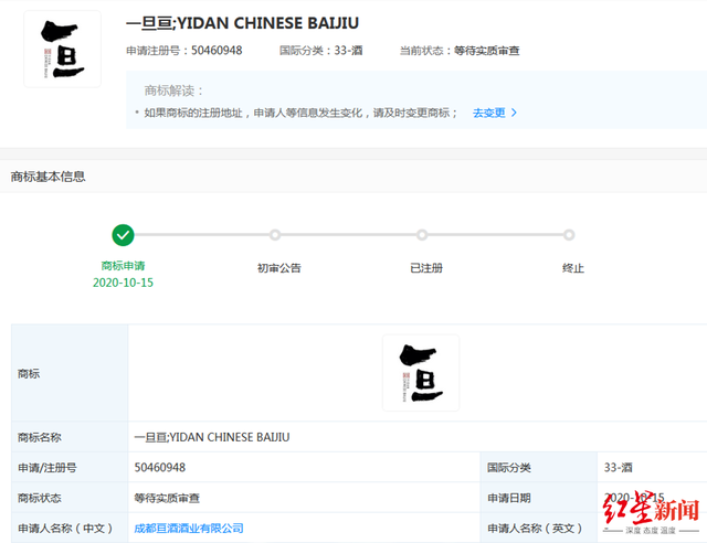成都這家名為“成都亙酒酒業(yè)有限公司”的企業(yè)去年10月提交了一份商標(biāo)申請(qǐng),商標(biāo)名稱為“一旦亙;YIDAN CHINESE BAIJIU”。