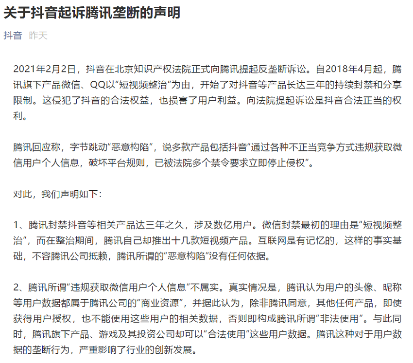 2月2日,字節(jié)跳動旗下的抖音宣布,向北京知識產(chǎn)權(quán)法院正式提交訴狀,起訴騰訊涉嫌壟斷。