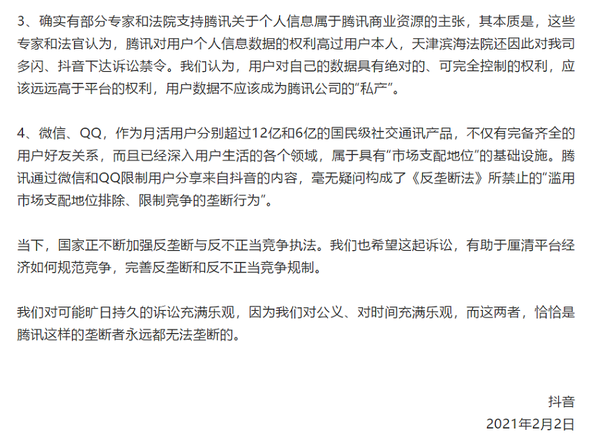對此,抖音認(rèn)為,“用戶對自己的數(shù)據(jù)具有絕對的、可完全控制的權(quán)利,應(yīng)該遠(yuǎn)遠(yuǎn)高于平臺的權(quán)利,用戶數(shù)據(jù)不應(yīng)該成為騰訊公司的‘私產(chǎn)’。”