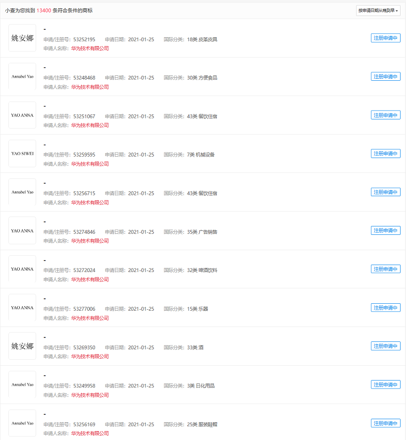 上述商標信息涉及到服裝鞋帽、鐘表珠寶、食品、教育娛樂、機械設備、科學儀器等多個行業,申請日期都是2021年1月25日,目前商標狀態顯示為“商標申請中”。據了解,華為一共申請了90條姚安娜相關的商標信息。