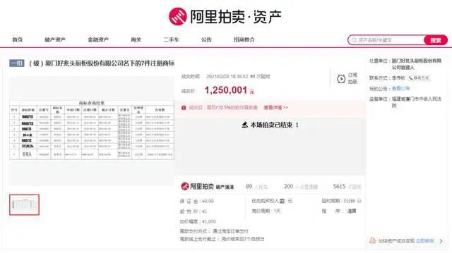 2月28日,備受關注的廈門好兆頭廚柜股份有限公司名下7件注冊商標順利完成拍賣,經過131次出價,最終拍出了1250001元。