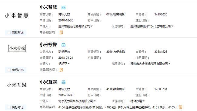 2019年4月深圳市雷美斯貿易有限公司申請09類“小米芯”商標,當前商標無效;2015年小米衛浴有限公司搶注11類“小米衛浴”,商標無效;還有更多“小米 2048 ”“小米故事 ”“小米榮耀”“小米智慧”“小米互娛”等商標均為無效狀態。