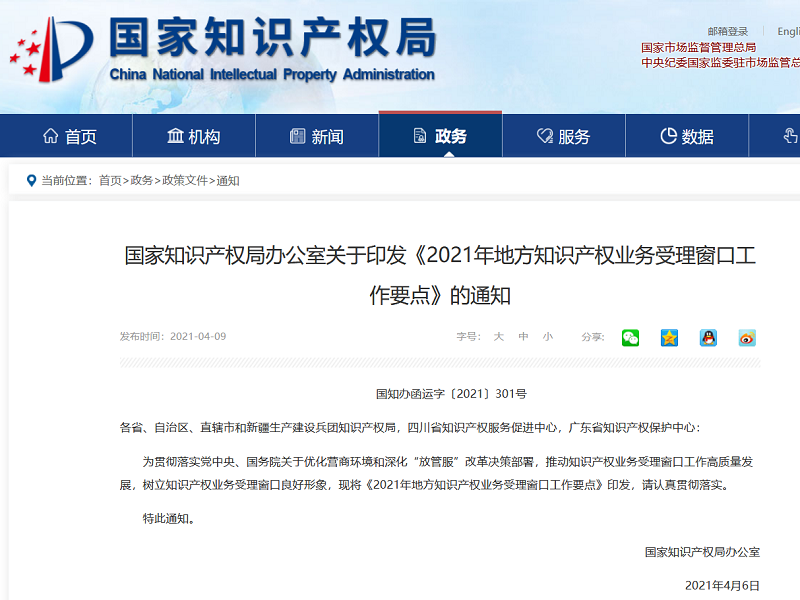 國(guó)家知識(shí)產(chǎn)權(quán)局辦公室關(guān)于印發(fā)《2021年地方知識(shí)產(chǎn)權(quán)業(yè)務(wù)受理窗口工作要點(diǎn)》的通知