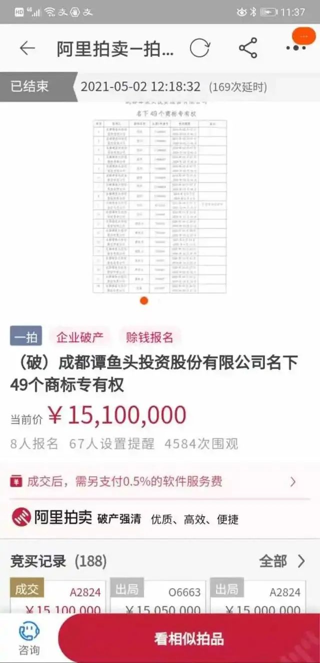 5月2日12點19分,經過188次競價和169次延時,“譚魚頭”名下49個商標終于以1510元價格成交。因競價過于激烈,原本上午10點就該結束的拍賣,169次延時至12時19分方結束。