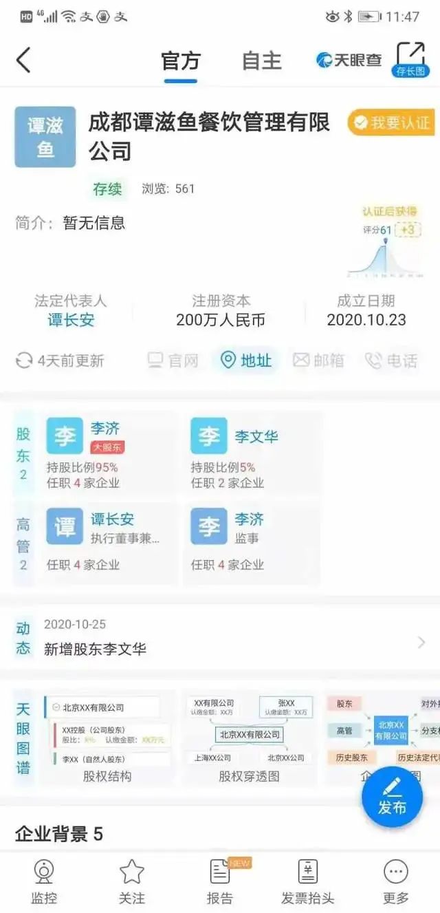 記者搜索天眼查發現,在2020年10月23日,譚長安又注冊了一家成都譚滋魚餐飲管理有限公司,他本人是法定代表人,注冊資本為200萬人民幣。“譚滋魚”成都首店已于1月正式營業,第二家店選址成都花園,五一開始裝修,預計7月1日開業。