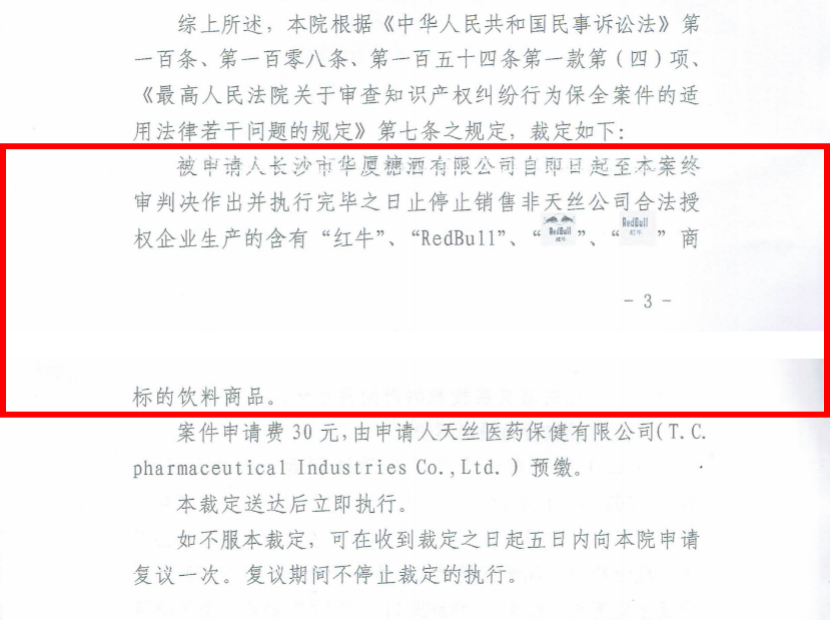 湖南省長沙市中級人民法院已于2021年5月28日依法作出“(2021)湘01民初564號之一”行為保全民事裁定書,裁定長沙市華廈糖酒有限公司“自即日起停止銷售非泰國天絲醫藥保健有限公司合法授權企業生產的含有‘紅牛’系列商標的飲料商品”。