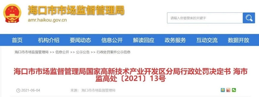 3月18日,海口市市場監(jiān)管局國家高新技術產業(yè)開發(fā)區(qū)分局向該公司送達《行政處罰聽證告知書》,告知將對該公司擬作出罰款20萬元的行政處罰,并舉行聽證會。