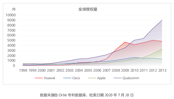 據《華為創新和知識產權白皮書》顯示,從 2004 年開始,華為公司全球專利授權量達到同行業領先的美國公司同等規模。下圖為華為公司及部分同行業公司在 1998-2013 年獲得全球專利授權數量統計圖。