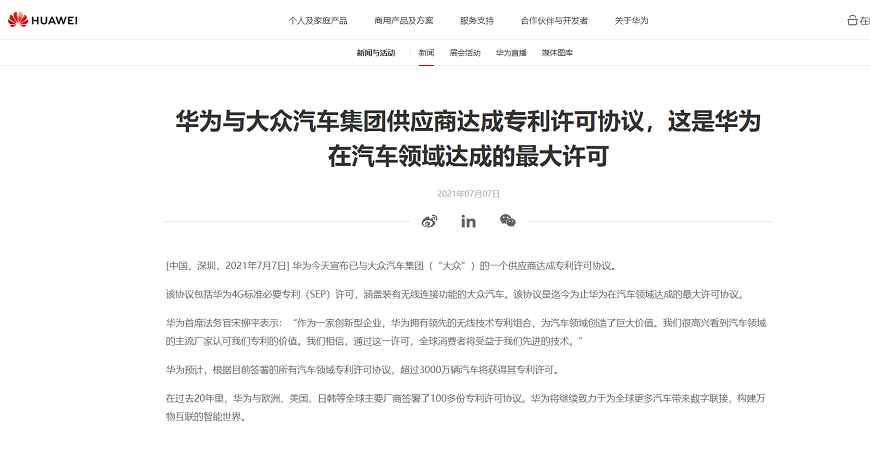 該協議包括華為4G標準必要專利(SEP)許可,涵蓋裝有無線連接功能的大眾汽車。該協議是迄今為止華為在汽車領域達成的最大許可協議。