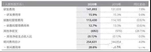 據華為2020年年度報告顯示,華為在2020年的研發投入為141,893百萬,研發費用率為15.9%,比2019年增加了0.6%。