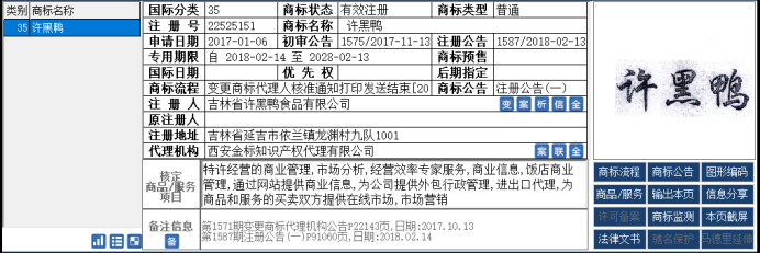 2017年1月,許黑鴨公司申請注冊“許黑鴨”商標,注冊號22525151,核定使用服務(第35類)。
