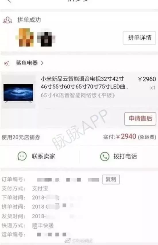 有用戶在拼多多上花 2960 元買到了 65 英寸小米新品云智能語音電視,到貨后發(fā)現該電視的前面板 Logo 確實是“小米新品”。
