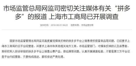 8月1日,國家市場監(jiān)督管理總局公告稱,高度重視媒體反映的拼多多平臺上銷售侵權假冒商品等問題,已經要求上海市工商局約談平臺經營者,要求上海市和其他相關地方工商、市場監(jiān)管部門,對媒體反映的以及消費者、商標權利人投訴舉報的拼多多平臺上銷售山寨產品、傍名牌等問題,認真開展調查檢查,不管是第三方平臺還是平臺內經營者,只要構成違法,都將依法嚴肅處理。