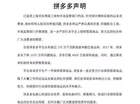 據最新消息稱,拼多多發(fā)表聲明并回應稱,將全力配合工商、市場監(jiān)管部門開展調查,進一步嚴厲打擊平臺上侵權假冒商品,努力達到社會和廣大消費者的期望。同時,拼多多表示,真誠歡迎社會各界群策群力,形成打擊侵權假冒商品的社會共治局面。