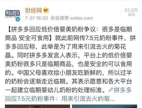 拼多多聯合創(chuàng)始人達達解釋,7.5元的標價實為商家引流時使用的菊花晶的標價,并非奶粉的標價,奶粉的標價實際上是19.9元,與淘寶網同類型產品價格一致。他宣稱,拼多多平臺從未出現嬰幼兒假奶粉、過期奶粉。