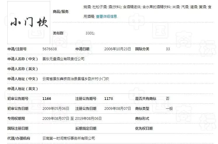 經查詢,早在2006年10月23日,就有公司在第33類“酒、飲料”類別申請“小門坎”商標,并于2009年8月7日注冊成功。