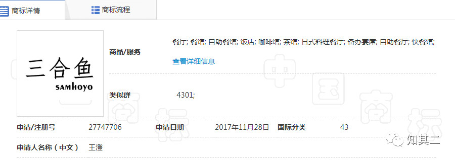 而在2017年11月28日,就有人在第43類餐飲類別申請注冊“三合魚”商標,目前狀態是等待駁回通知發文。顯然“三合魚”是火鍋魚的一種,是通用名稱,不能作為商標使用。