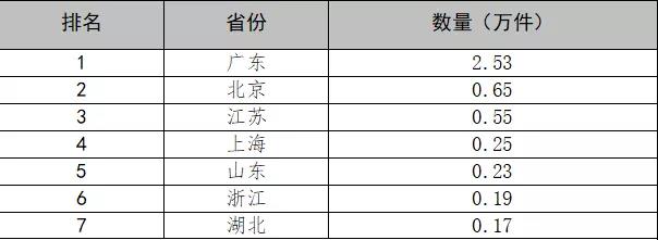 2018年,共受理PCT國際專利申請5.5萬件,同比增長9.0%。其中,5.2萬件來自國內,同比增長9.3%。PCT國際專利申請超過1000件的排名前3位的省(區、市)依次為:廣東(2.53萬件)、北京(0.65萬件)、江蘇(0.55萬件)。